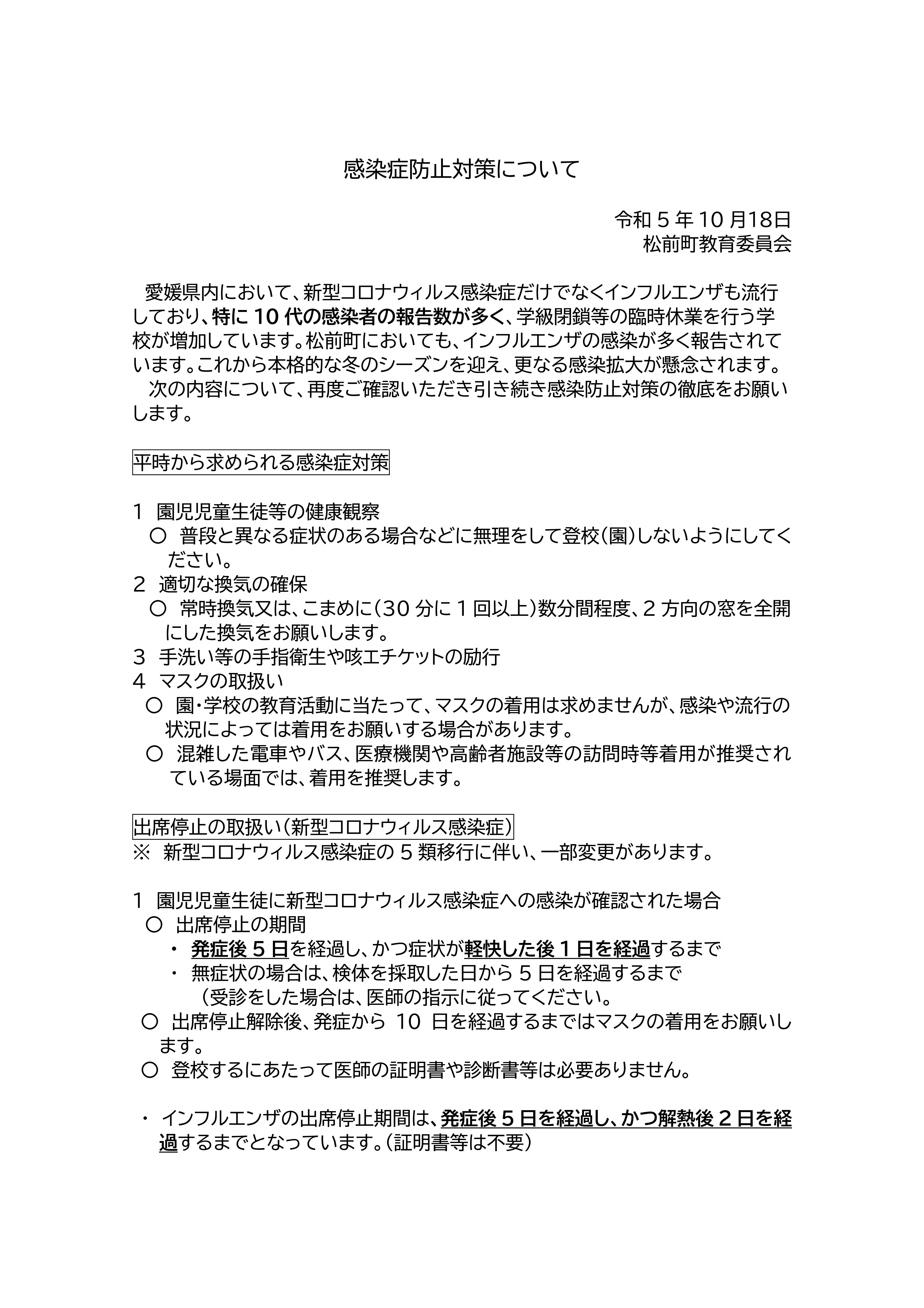 本日、松前町教育委員会より別添のとおり感染症防止対策に関する文書が参りました。愛媛県内において、新型コロナウイルス感染症だけでなく、インフルエンザも流行しており、特に10代の感染者の報告数が多い状況となっております。松前町においても、インフルエンザの感染が多く報告されています。