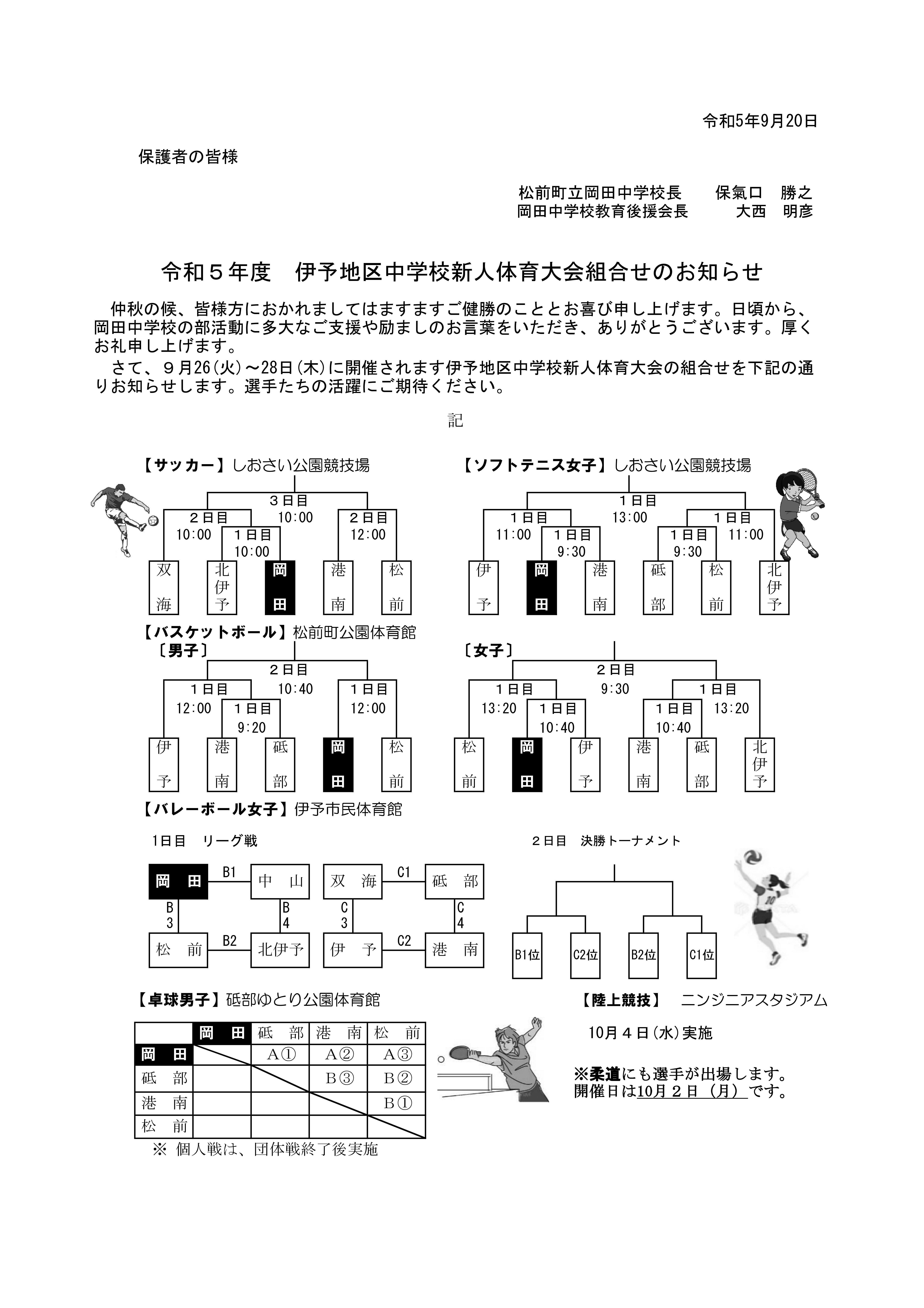 9月26(火)~9月28日(木)に開催を予定しております新人体育大会の組合せが決定しましたので、添付ファイルにてお知らせします。
