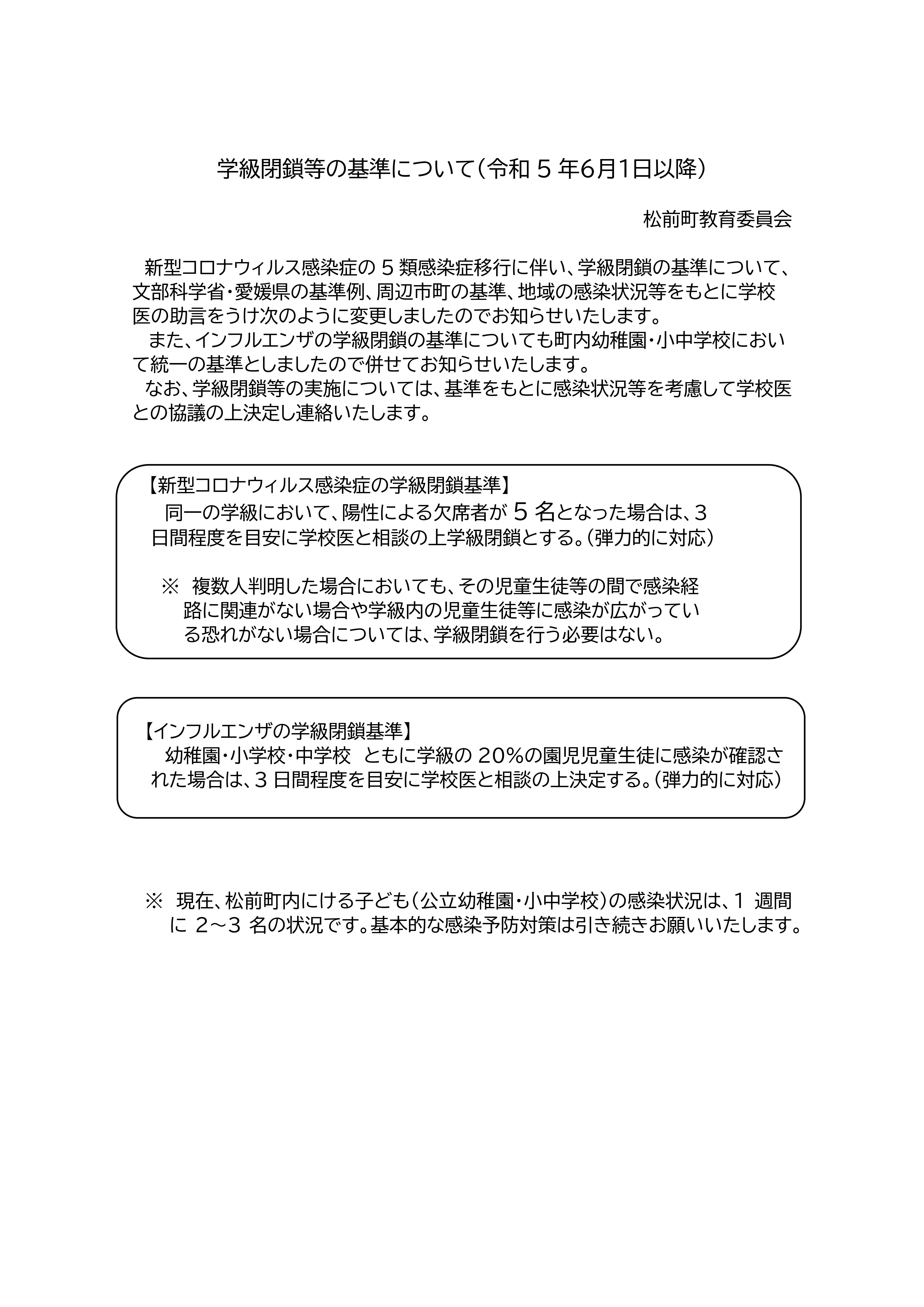 新型コロナウイルス感染症の5類感染症移行に伴い、学級閉鎖等の基準について、松前町教育委員会より変更した旨の連絡が参りました。詳しい内容につきましては、添付資料をご覧ください。