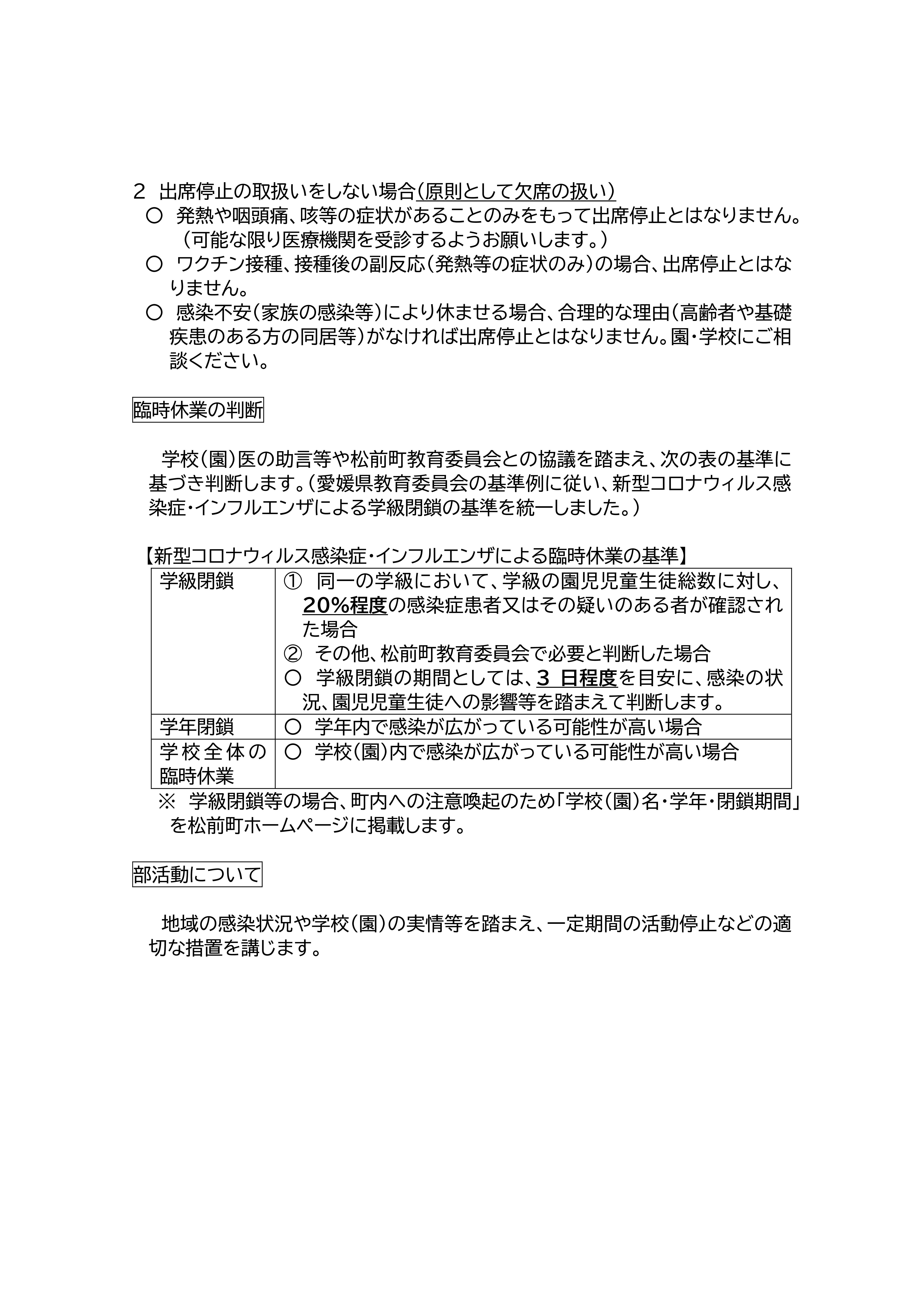 本日、松前町教育委員会より別添のとおり感染症防止対策に関する文書が参りました。愛媛県内において、新型コロナウイルス感染症だけでなく、インフルエンザも流行しており、特に10代の感染者の報告数が多い状況となっております。松前町においても、インフルエンザの感染が多く報告されています。